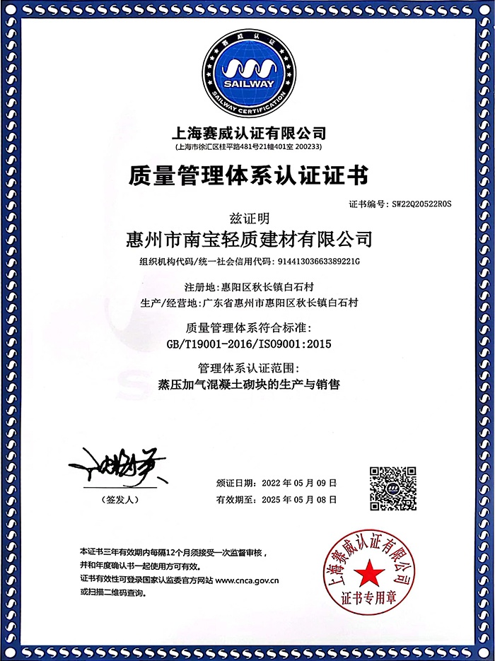 廣東省惠州市南寶輕質(zhì)建材有限公司成立于2007年,公司一直致力于新型環(huán)保的墻體材料的開發(fā)、生產(chǎn)和銷售服務(wù),生產(chǎn)的蒸壓加氣混凝土砌塊遍布惠州、深圳及周邊城市,以高品質(zhì)、高性價(jià)比的產(chǎn)品和優(yōu)良的服務(wù)質(zhì)量榮獲良好的行業(yè)口碑,公司于2020年再接再勵(lì),投入3000余萬(wàn)資金引進(jìn)行業(yè)領(lǐng)先的6米全自動(dòng)加氣混凝土砌塊生產(chǎn)線,具備年產(chǎn)量40萬(wàn)方加氣混凝土砌塊的產(chǎn)能,同時(shí)使產(chǎn)品品質(zhì)、性能更加優(yōu)越。